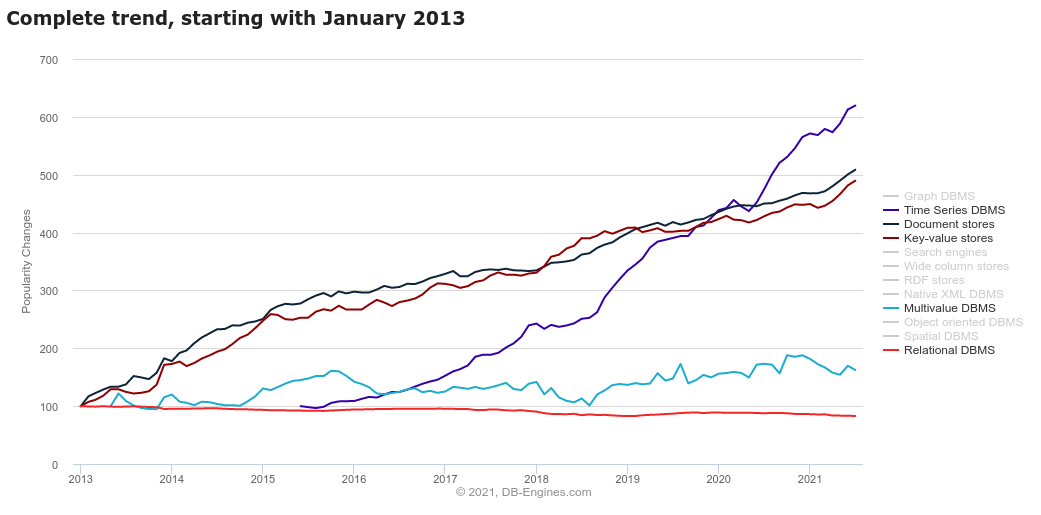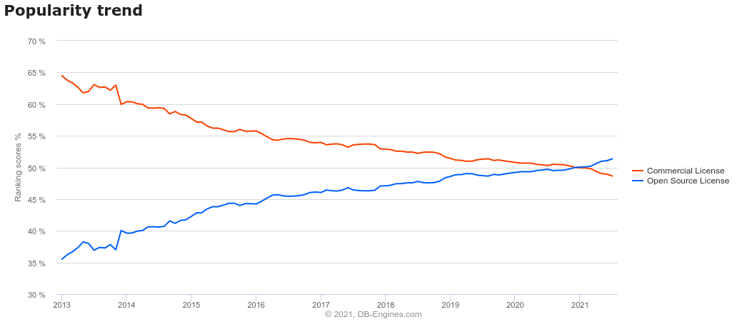 Looking at DB-Engines Ranking, we will see that the popularity of open-source databases has been growing over the years, while commercial databases have been gradually declining.