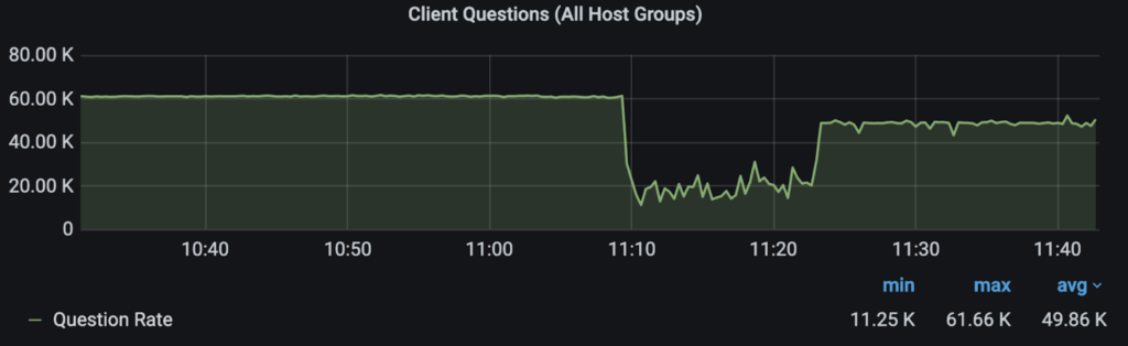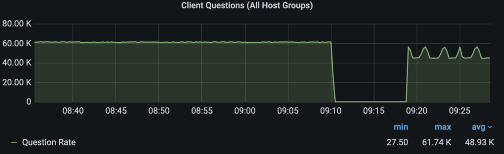 The above graph shows the lag constantly growing until the script starts to run and the replica eventually catches up. Fantastic! Until you see the Questions graphs and it looks very….flat
