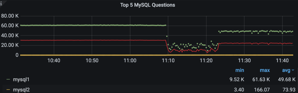 And the above graph shows the same (questions) but from the ProxySQL dashboard perspective.