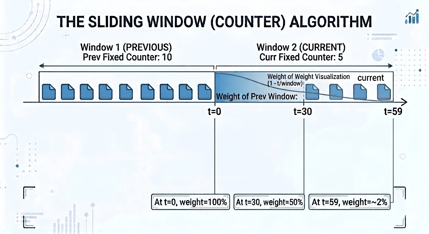 The formula assumes requests were uniformly distributed across the previous window. If someone fired all their requests in the last second of the previous window, the algorithm will underestimate the true rate slightly. For auth gateways and API rate limiting this is fine. But for compliance use cases, still use the sliding log.