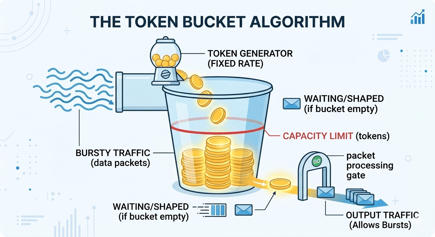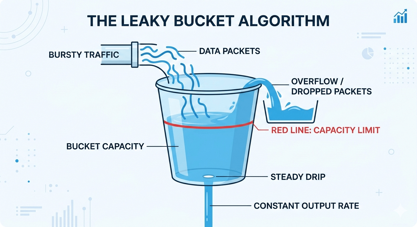 Often confused with the token bucket. The difference is that the token bucket limits inbound rate but allows bursts; leaky bucket shapes outbound traffic to a constant rate. Think of it as a queue that drains at a fixed rate. Requests join the queue. If the queue is full, they’re dropped. The downstream service only ever sees a smooth, constant flow.