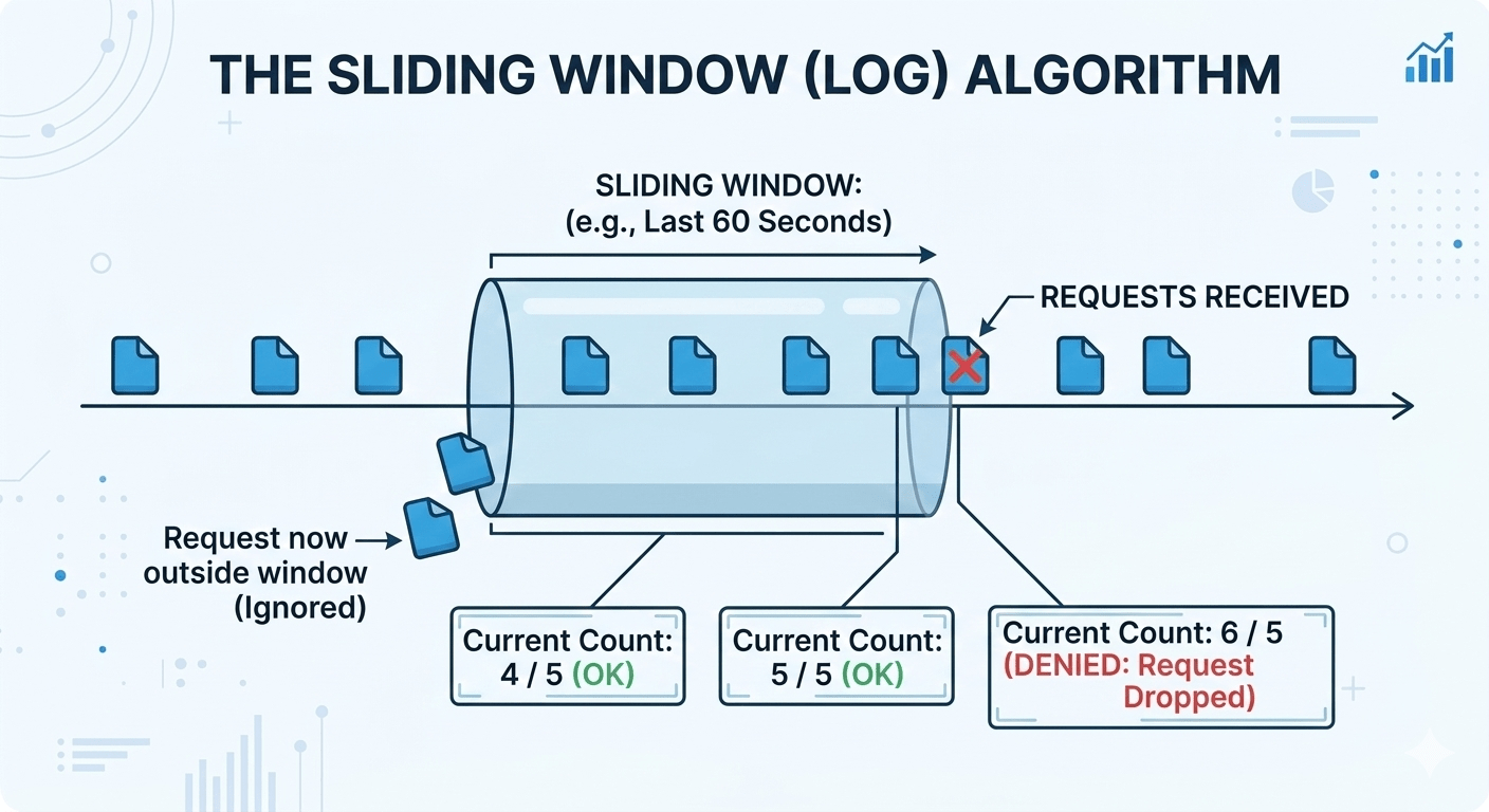 Instead of resetting a counter at a fixed boundary, store a timestamped log of every request in a sorted set. The window slides with every request.