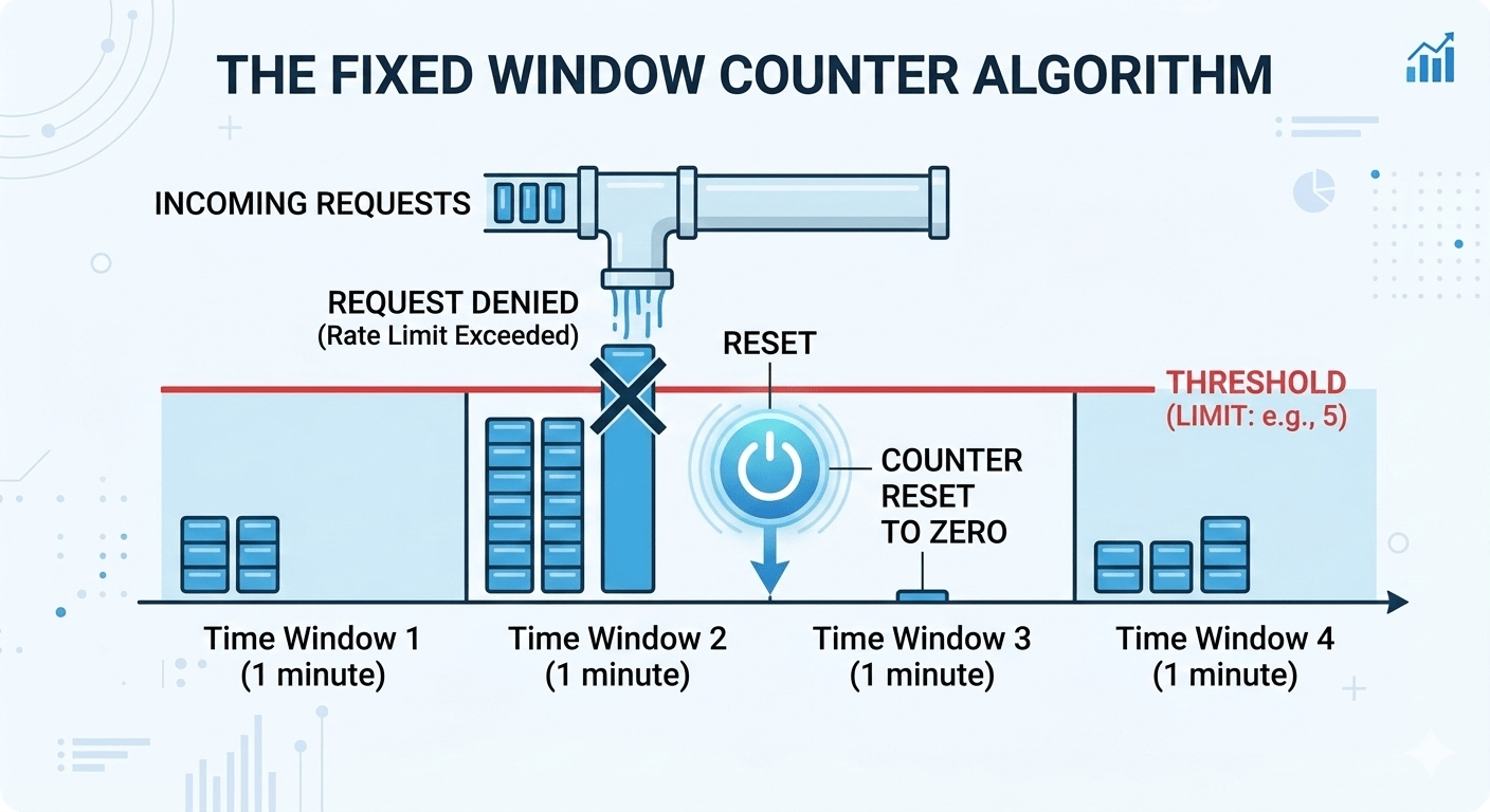 The simplest algorithm. Divide time into discrete windows (e.g. 60 seconds), count requests per window, and reject anything over the limit.