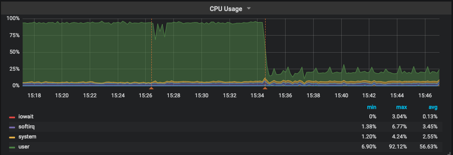 It’s important to understand where the CPU time is being consumed: user space, system space, iowait, and so on. Here we can see that CPU usage was hitting almost 100% and the majority of the time was being spent on user space. In other words, the time the CPU was executing user code, such as MySQL. Once we determined that the time was being spent on user space, we could discard other possible issues. For example, we could eliminate the possibility that a high amount of threads were competing for CPU resources, since that would cause an increase in context switches, which in turn would be taken care of by the kernel – system space.