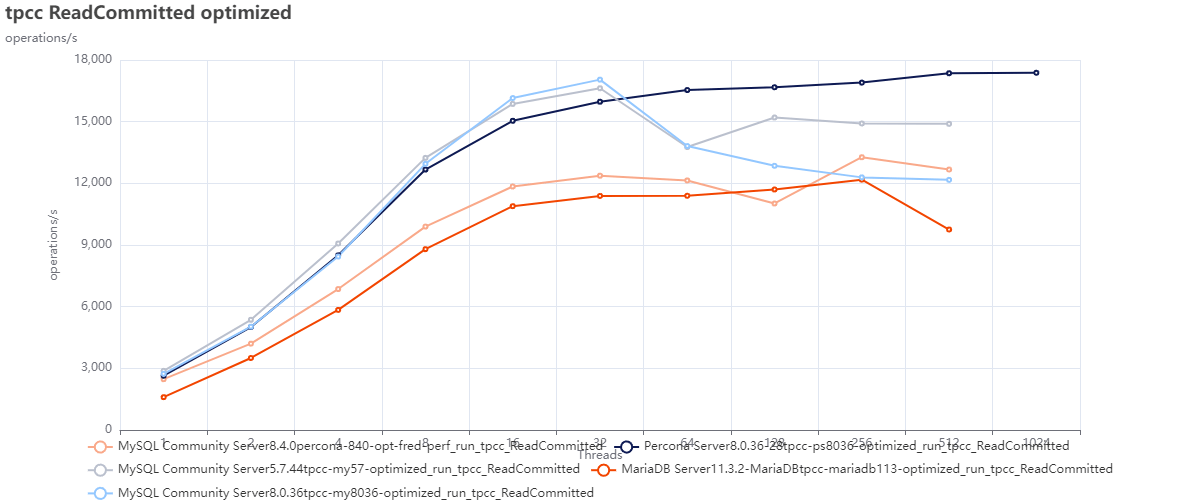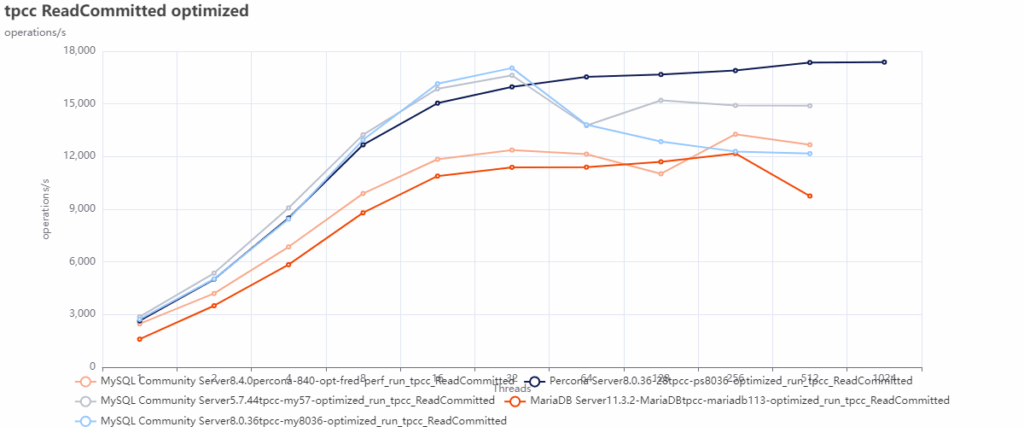 As expected, MySQL 8.4 is not acting well here either, and only MariaDB is performing worse. Note how Percona Server for MySQL 8.0.36 is the only one able to handle the increased contention.