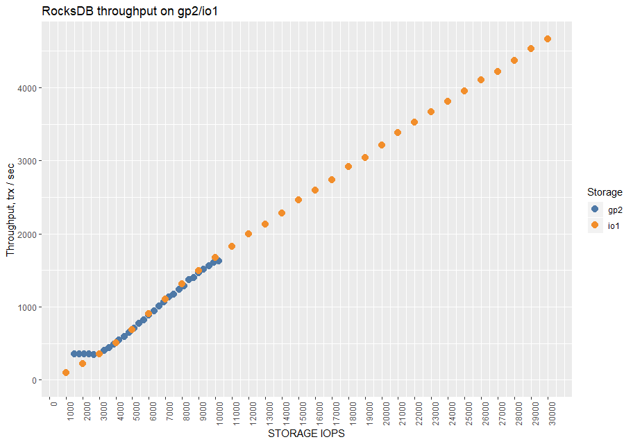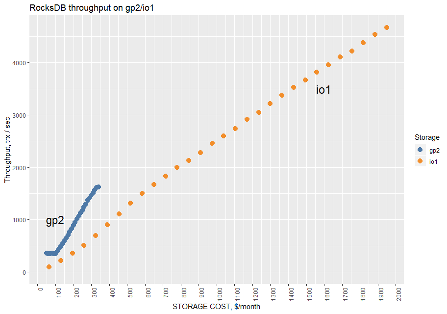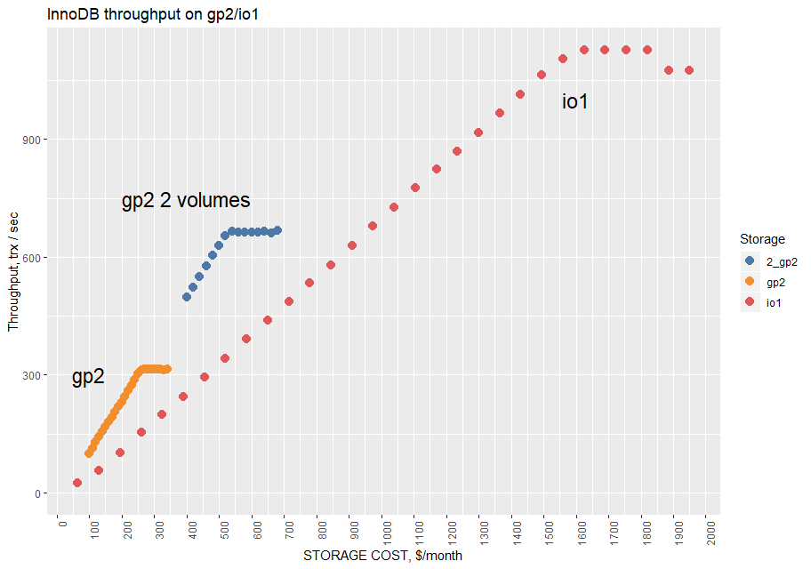 This charts also shows that it is cheaper to run on gp2 volume but only while it provides enough IOPS. I assume that using two gp2 volumes would allow me to double the throughput. (I did not run the test for MyRocks using two volumes)