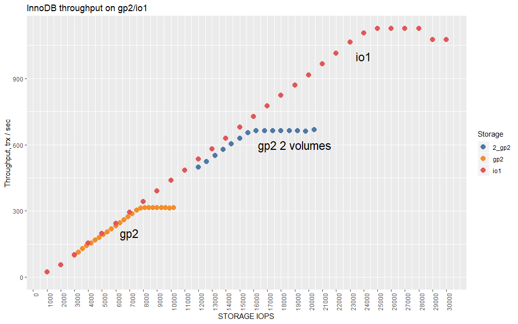It’s interesting to see here the slope for gp2 volumes is steeper than for io1 volumes. This means we can get a bigger increase in InnoDB performance per dollar using gp2 volumes, but only until we reach the IOPS and throughput limits that are applied to gp2 volumes.