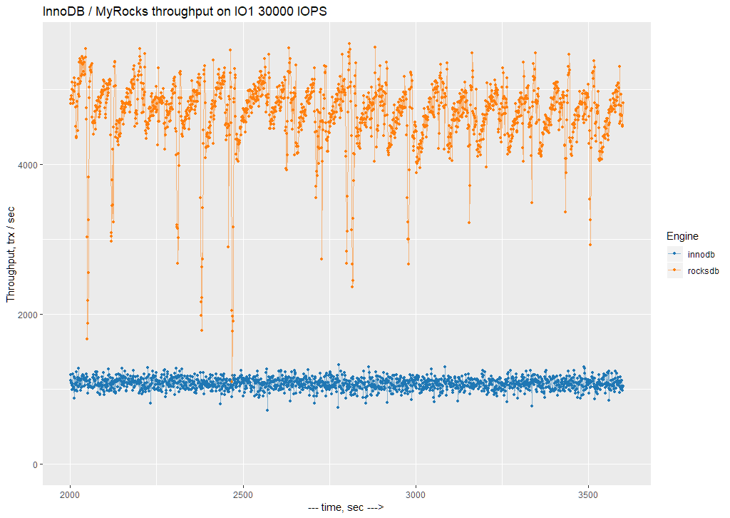So for MyRocks there seems to be periodical background activity, which does not allow it to achieve a stable throughput.