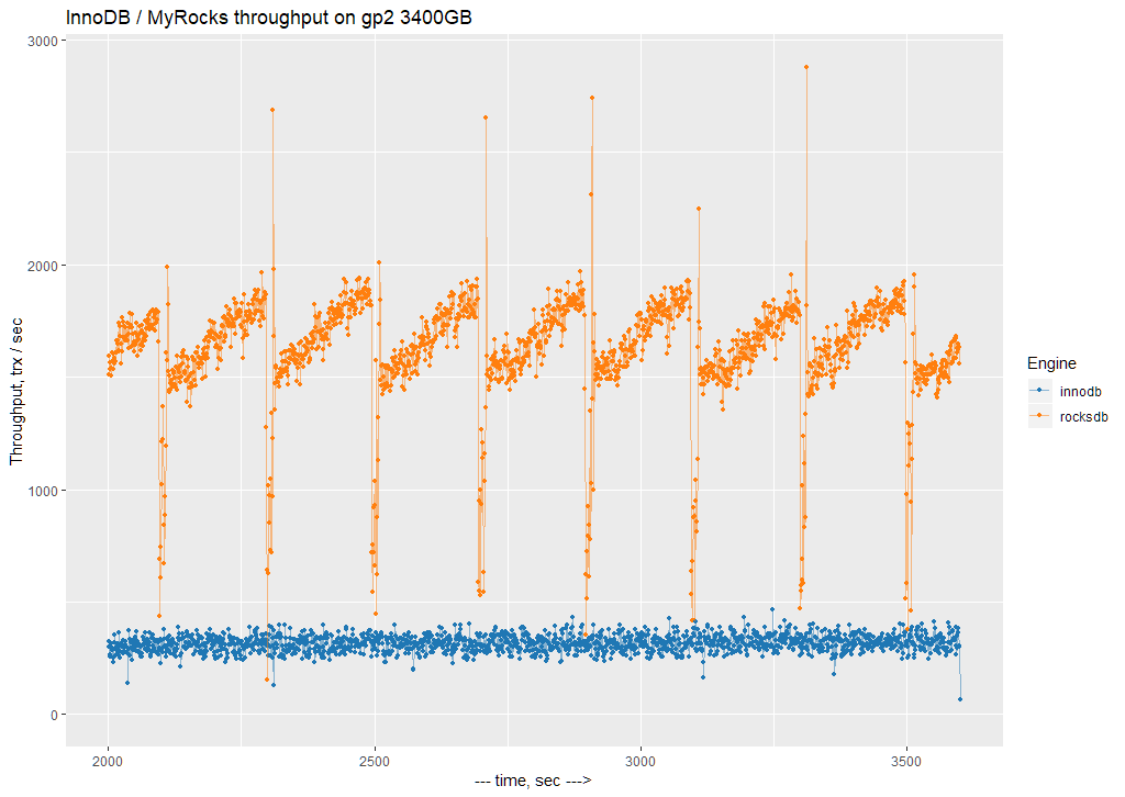 It’s quite interesting to see how the result scales with better IO throughput. InnoDB does not improve its throughput after gp2 size 2600GB, while MyRocks continues to scale linearly. The problem with MyRocks is that there is a lot of variance in throughput (I will show a one second resolution chart).