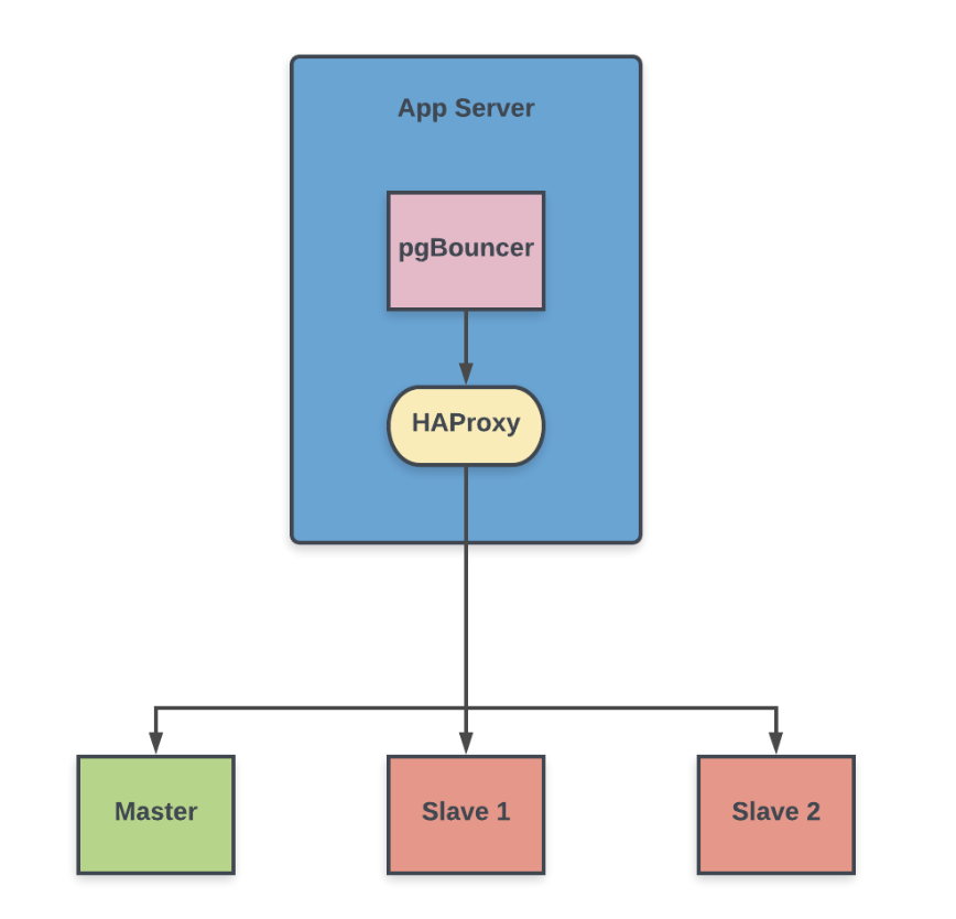 The following diagram represents a simplified part of the architecture that composes the enterprise-grade solution we’ve designed, where we employ PgBouncer and HAProxy to scale our PostgreSQL cluster:
