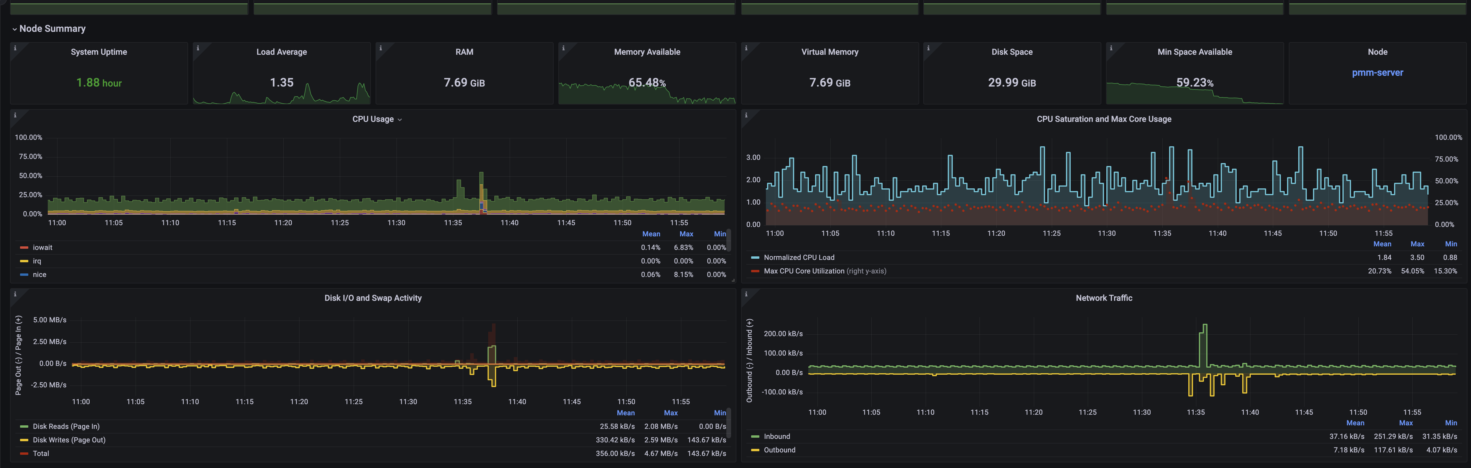 The next row shows the health status of the node on which PMM is running. This section provides essential metrics and data about the main node.