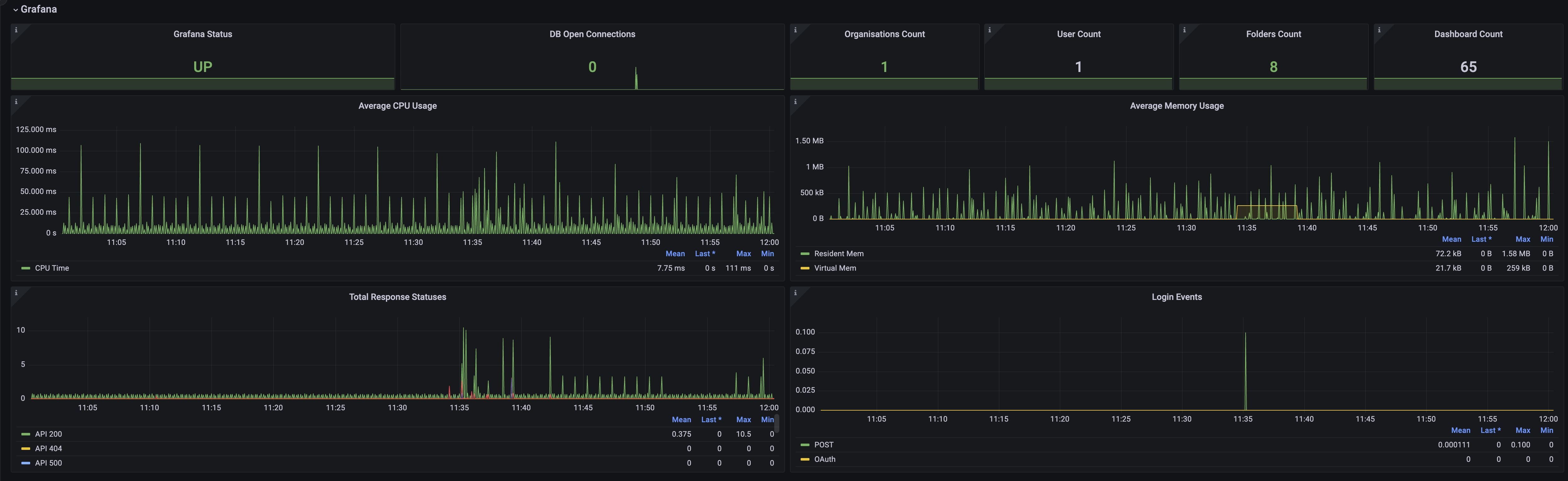 The Response Statuses panel helps monitor the activity levels of dashboards and other Grafana components, making it easier to identify issues such as 404 or 500 response codes.