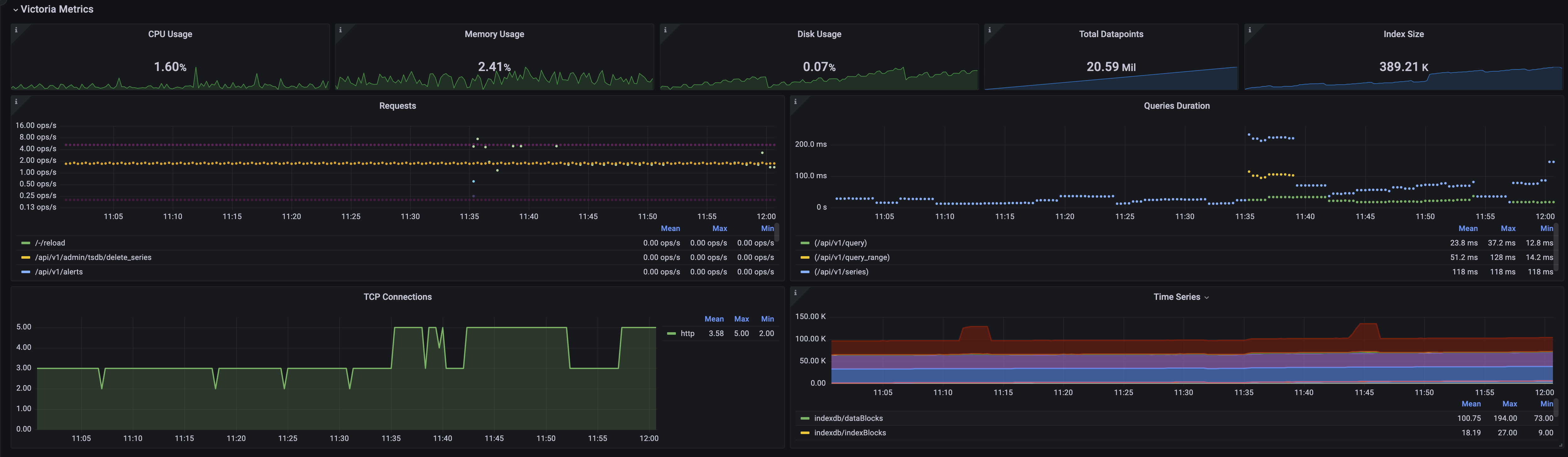 One of the most commonly used storage systems in PMM is VictoriaMetrics (VM), which is responsible for storing all metrics. This section presents various VM metrics, such as CPU and memory usage, disk usage, and sizes of data points and indexes. It also displays the usage of requests and query duration over time, allowing you to identify anomalies. Additionally, the TCP Connections panel provides further insights into PMM usage, while the Number of Time Series panel highlights a crucial metric for efficient PMM performance.