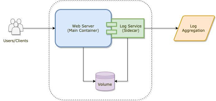 The most common example you’ll likely find is a web server plus a log forwarding service (pictured above). The web server is the main container, the log forwarder is the sidecar, and in this case they actually share data (the volume is mounted to both containers). The web server writes the data, while the log forwarder just reads and sends it along (perhaps to some aggregation service like Splunk).