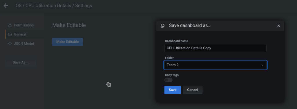 5. Now we make copies of the “CPU Utilization Details” dashboard in folders “Team1” and “Team2”