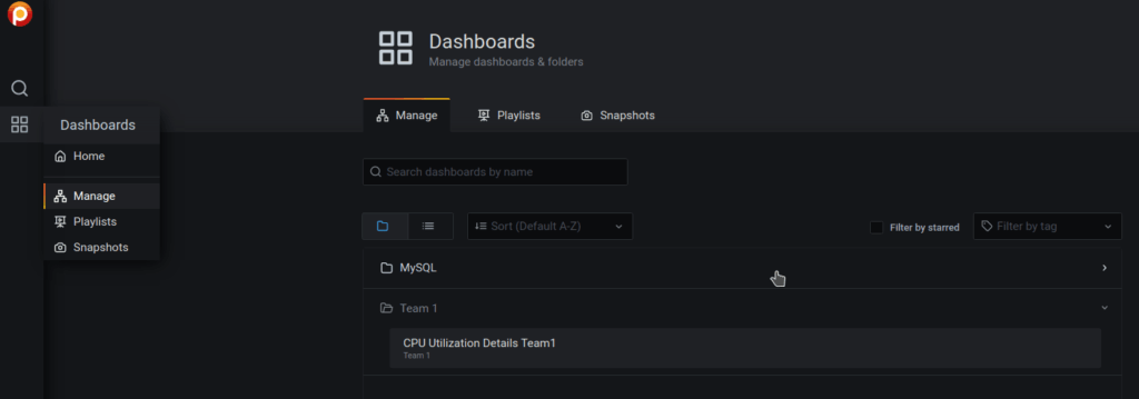 So now users can view only dashboards in folder “MySQL” and “Team1″/”Team2”. In the next step, we will apply limits by servers.