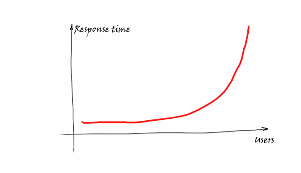 Basically the more users who are coming, the less requests/sec the system is able to handle. The reason is that working processes require internal communication and synchronization. At some point the system becomes unresponsive and practically stuck. Well-known DDoS attacks are based on this behavior — to load a system with so many requests that it is not able to proceed.