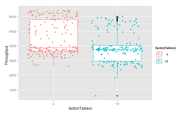 <br>m <- ggplot(dd,<br> aes(x = factor(Tables),y=Throughput,color=factor(Tables)))<br>m+geom_boxplot()+geom_jitter()<br> |