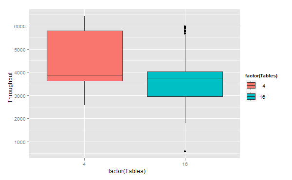 <br>m <- ggplot(dd,<br> aes(x = factor(Tables),y=Throughput,fill=factor(Tables)))<br>m+geom_boxplot()<br> |