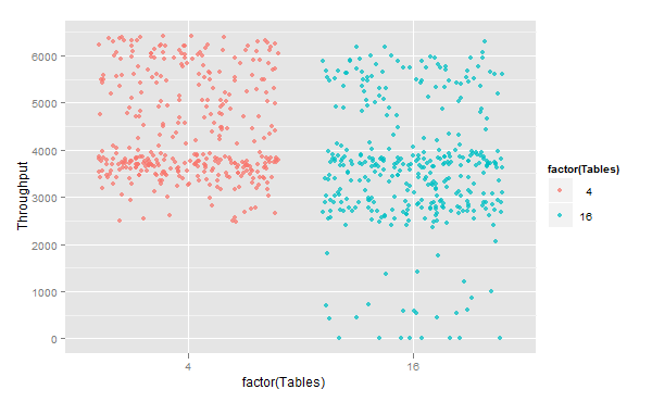 <br>m <- ggplot(dv.ver,<br> aes(x = factor(Tables), Throughput, color=factor(Tables)))<br>m + geom_jitter(alpha=0.75)<br> |