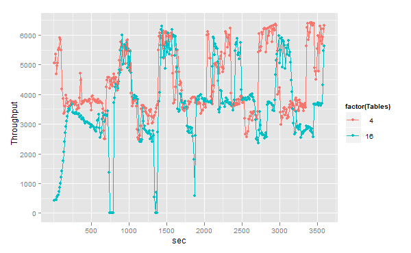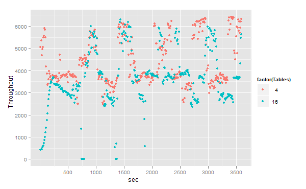 <br>m <- ggplot(dv.ver,<br> aes(x = sec, Throughput, color=factor(Tables)))<br>m + geom_point()<br> |