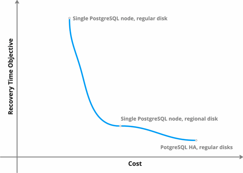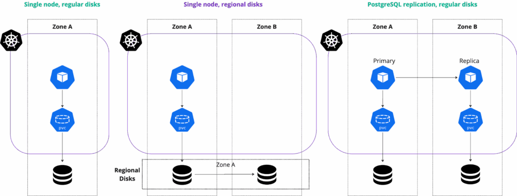 | Single PostgreSQL node, regular disk | Single PostgreSQL node, regional disks | PostgreSQL HA, regular disks | |
