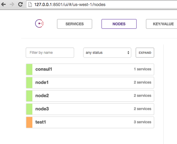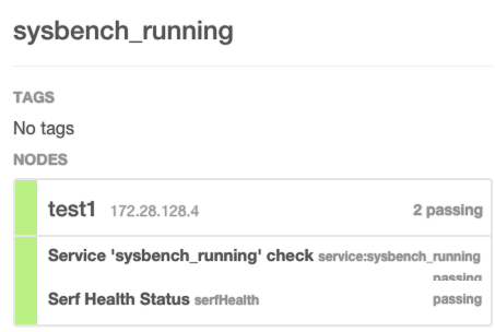 I can see all 5 of my nodes. I can check the services and see that test1 is failing one health check because sysbench isn’t running yet: