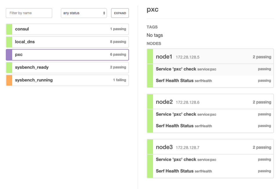 Notice ‘pxc.service.consul’. This hostname is provided by Consul and resolves to all the IPs of the current servers both having and passing the ‘pxc’ service health check: