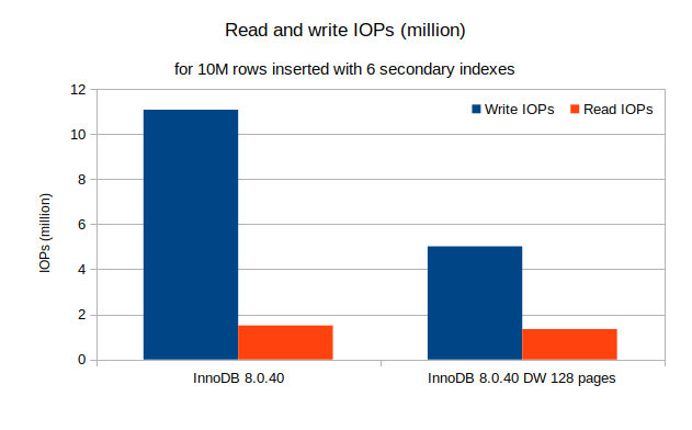 The number of write IOPs is down by more than half (55%), and the number of read IOPs is reduced by 10%. This large difference is likely caused by the low concurrency I used to generate the IOPS, a single insert thread. Nevertheless, replication is often also fairly low on concurrency.