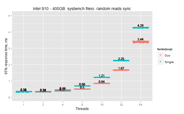 I would say for single device the throughput peaking at 8 threads with 95% response time 0.68ms, and for Duo at 16 threads with 0.84ms