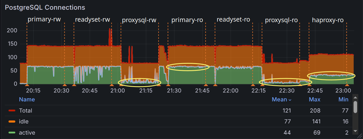 - Except for the tests in which all traffic is directed to the primary (primary-rw and primary-ro), or load-balanced between primary and secondary (haproxy-ro), the primary is not processing the target SELECTs.