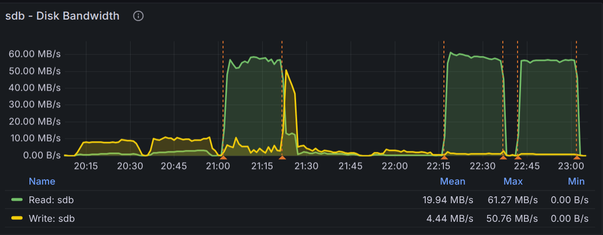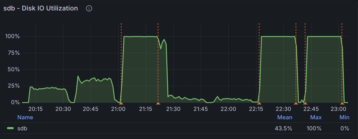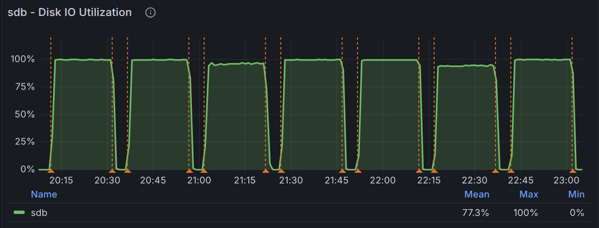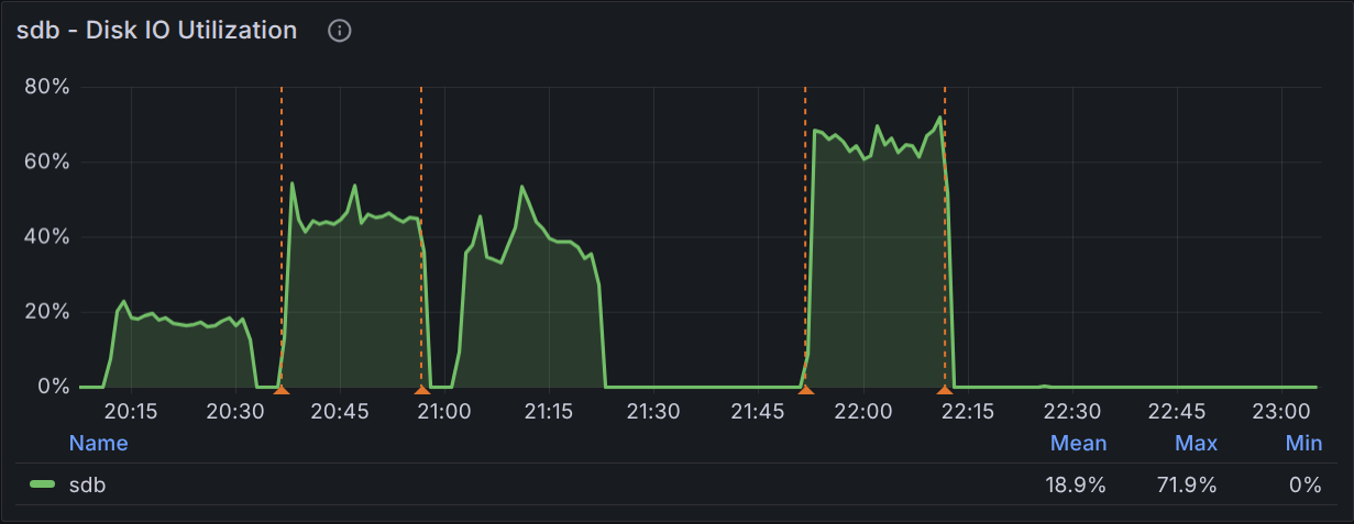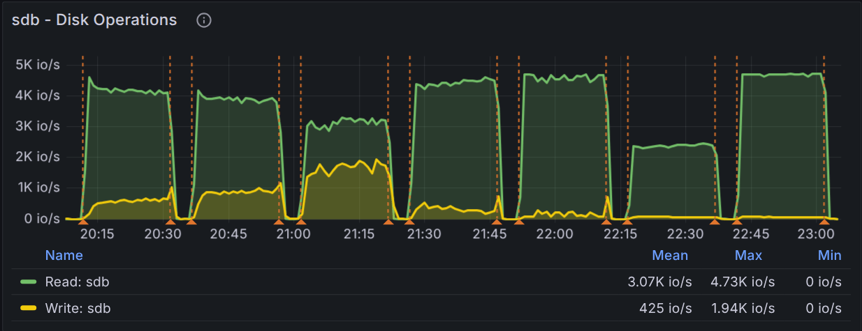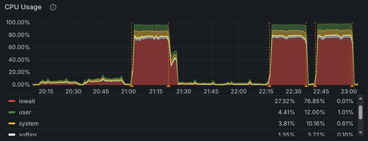 Since the regular disks I used on the data servers have their performance “capped” by the cloud provider for the respective instance type and size, the ones hosting PostgreSQL were either hitting an IOPS limit or a bandwidth limit: