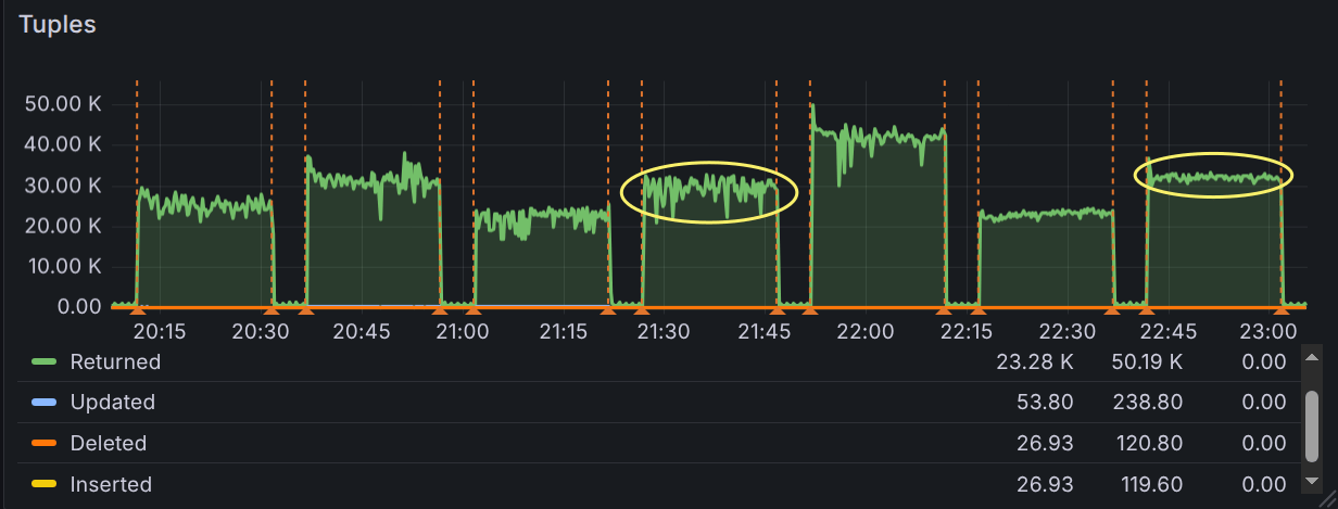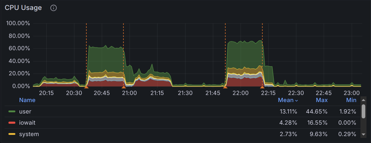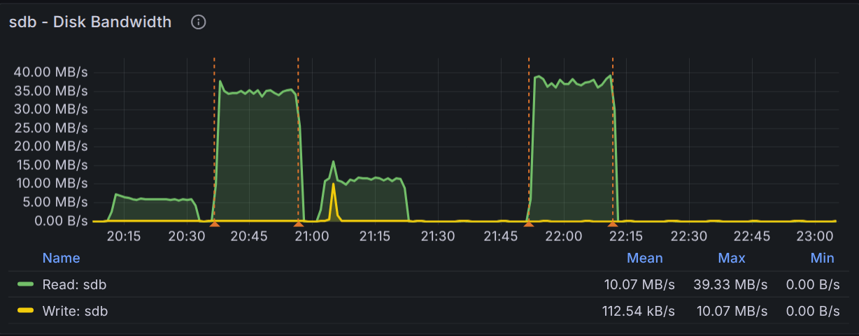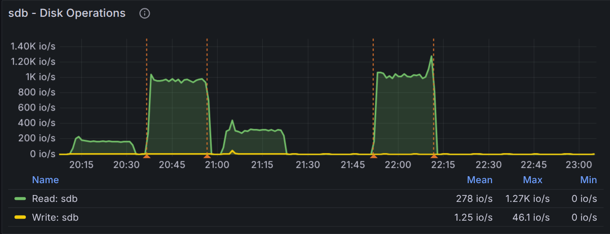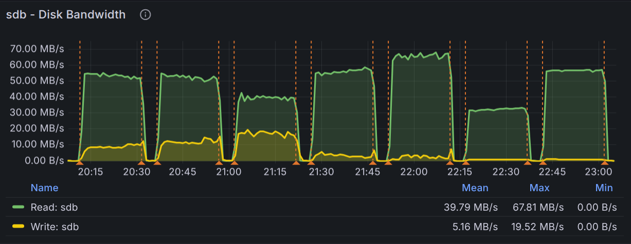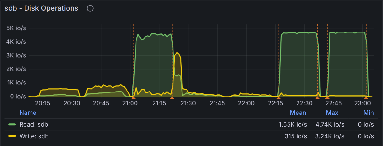 Since the regular disks I used on the data servers have their performance “capped” by the cloud provider for the respective instance type and size, the ones hosting PostgreSQL were either hitting an IOPS limit or a bandwidth limit: