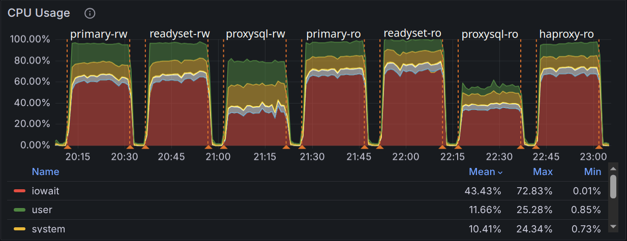 If we look at the CPU usage graphs presented earlier, that’s when the standby server is operating at disk capacity, both processing the replication changes generated by the primary and serving the target SELECTs routed to it by ProxySQL.