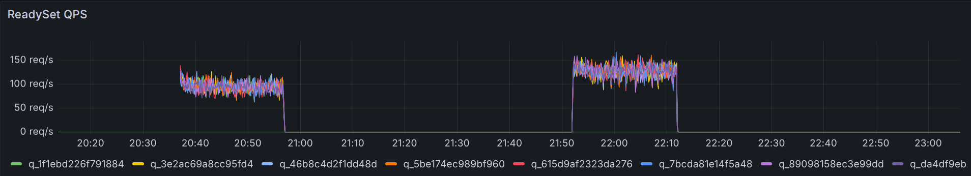 - The ReadySet QPS graph shows the requests being processed by ReadySet in each of the two quests (readyset-rw on the left, readyset-ro on the right). Its legend is filled with the IDs of the queries we created “caches” for.