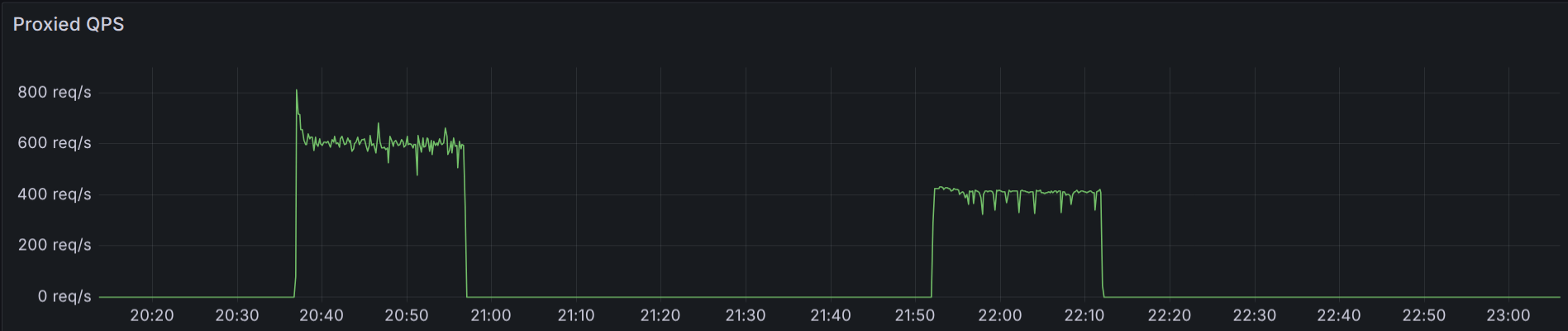 - The Proxied QPS graph shows the requests that have been “proxied” to the primary server, which should be all the remaining traffic from the two workloads.