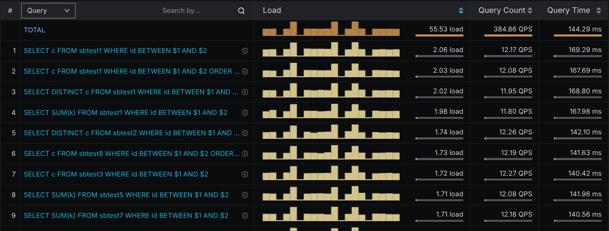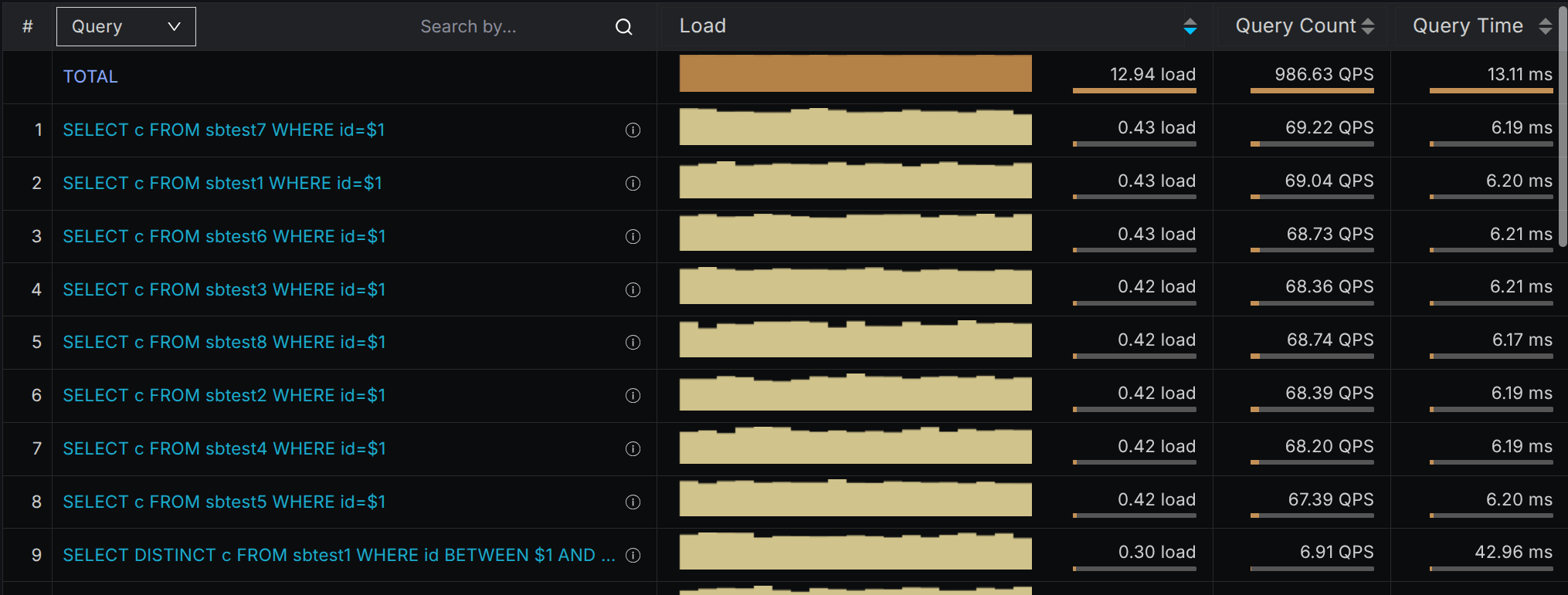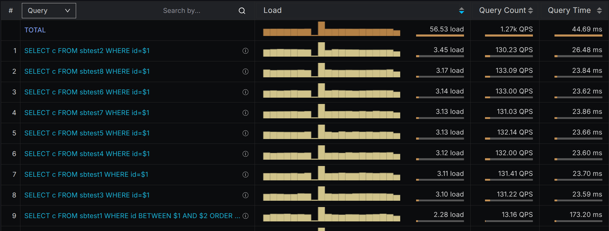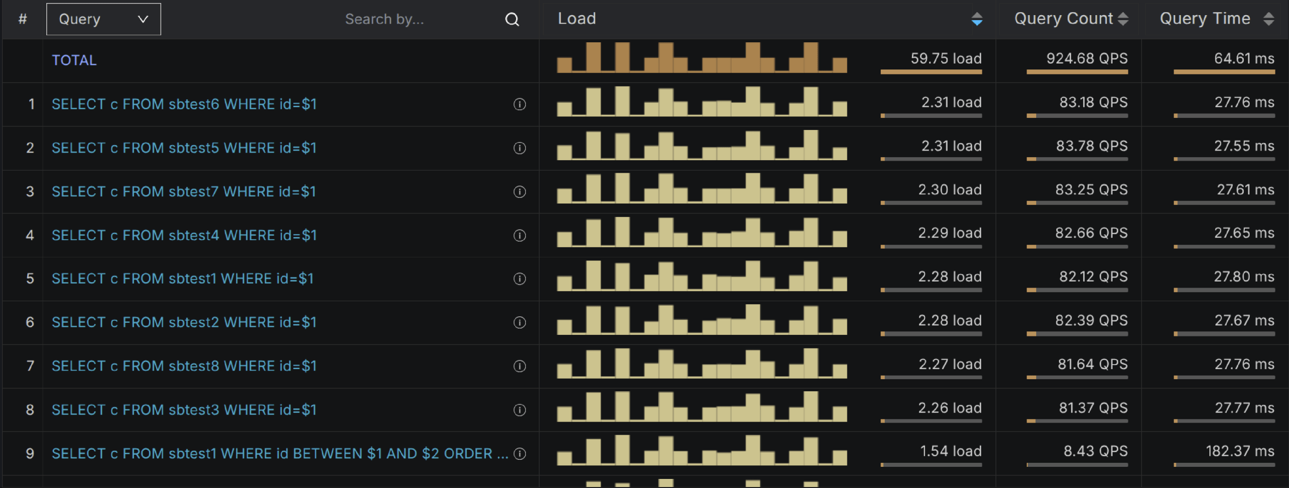 QAN tracked the queries processed in the primary during the tests with ReadySet, but since it doesn’t have data on the latter, it cannot provide query distribution for those tests. We will have a look at this in a different way later.