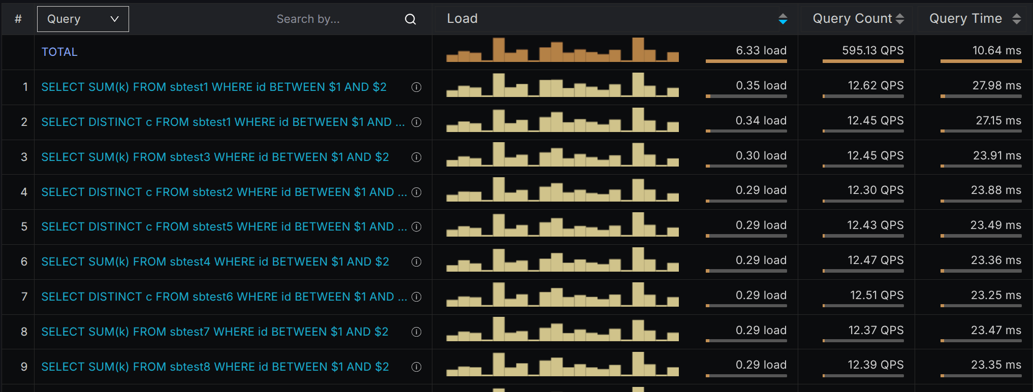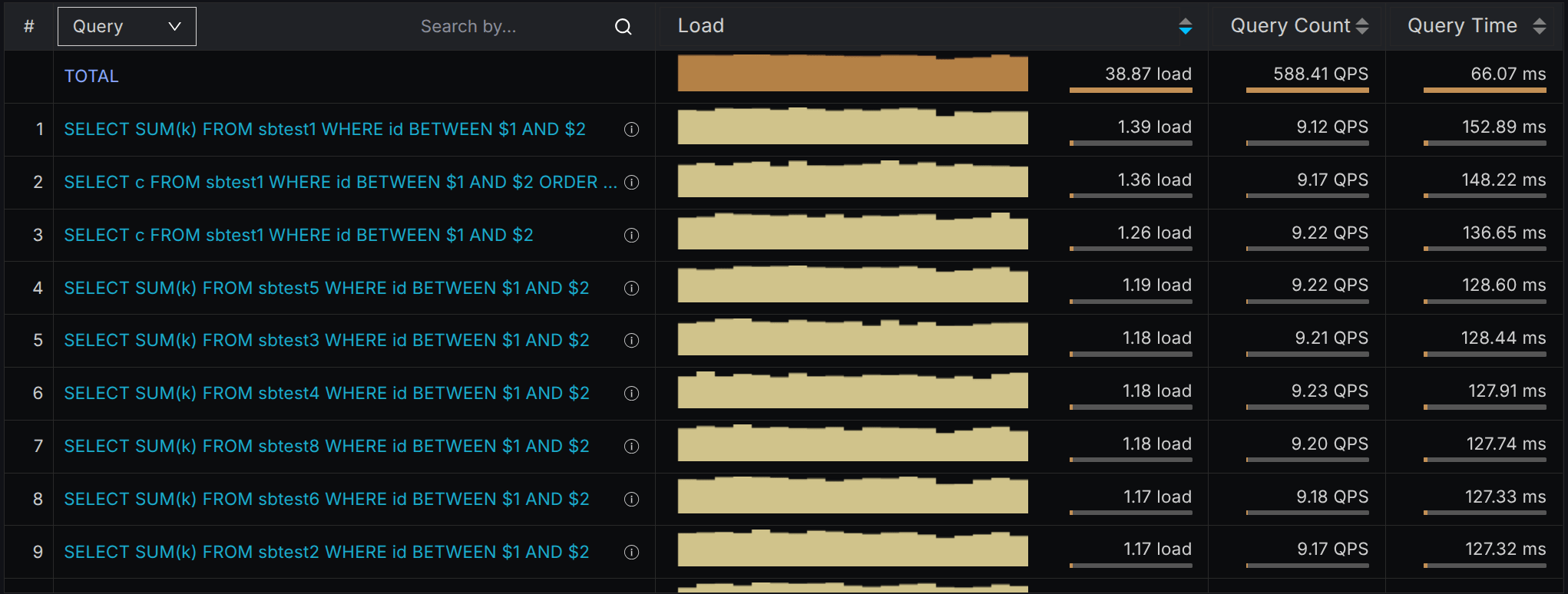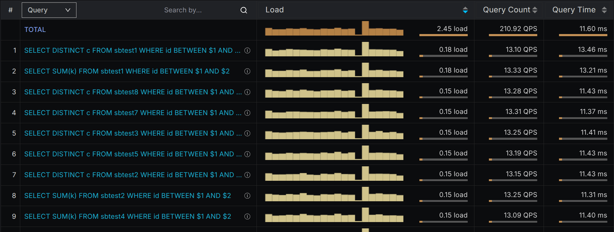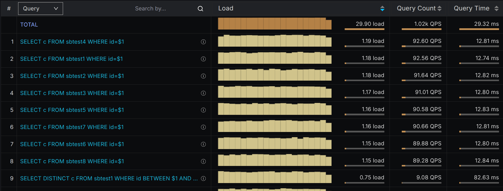 QAN tracked the queries processed in the primary during the tests with ReadySet, but since it doesn’t have data on the latter, it cannot provide query distribution for those tests. We will have a look at this in a different way later.