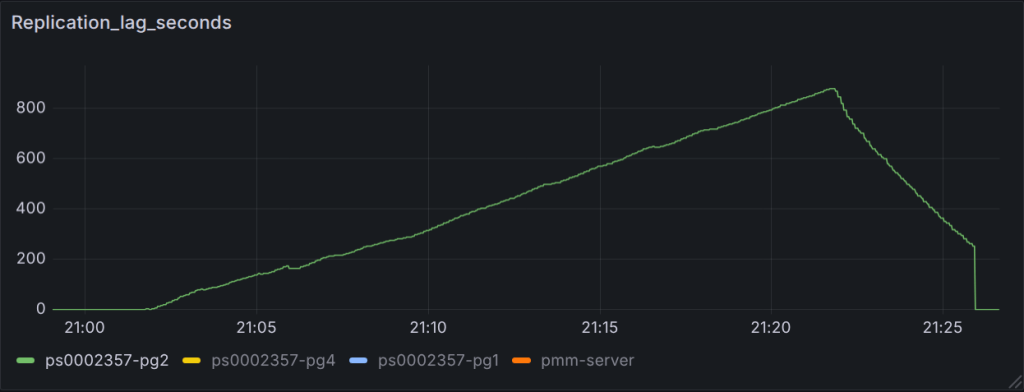My colleague Neha, from the Managed Services team, gave me a hand and provided a copy of one of the graphs they are using to monitor customer environments based on the pg_replication_lag_seconds metric (which is being actively collected by the PostgreSQL explorer), while they wait for the official one. Here is a close look at the only test that triggered the issue on the standby server, proxysql-rw: