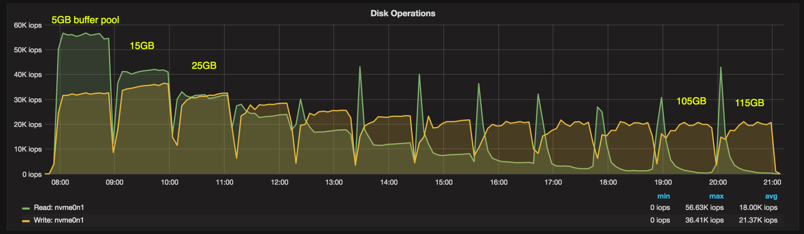 We can see that for the 5GB buffer pool size we have 56000 read IOPs operations and 32000 write IOPs. For 115GB, the reads are minimal at about 300 IOPS and the background writes are at the 20000 IOPs level. Reads gradually decline with the increasing buffer pool size.