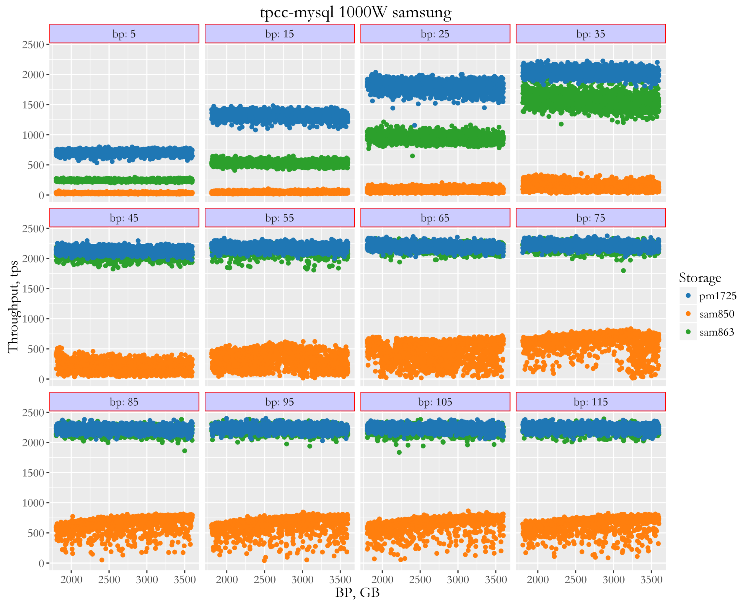 The Samsung 850 obviously can’t keep with the more advanced SM863 and PM1725. The PM1725 shows a greater benefit with smaller buffer pool sizes. In cases using large amounts of memory, there is practically no difference with SM863. The reason is that with big buffer pool sizes, MySQL does not push IO subsystem much to use all the PM1725 performance.