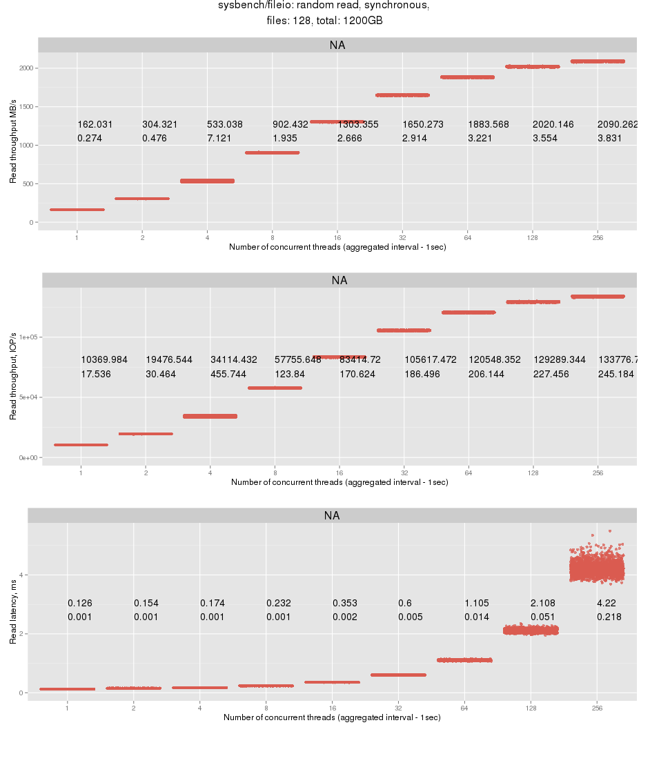 At 256 threads, read throughput tops out at 2090MiB/sec, which is about 20% less than the asynchronous results; given the small bump in throughput going from 128 to 256 threads and the doubling of latency that was also introduced there, this is likely about as good as it is going to get.