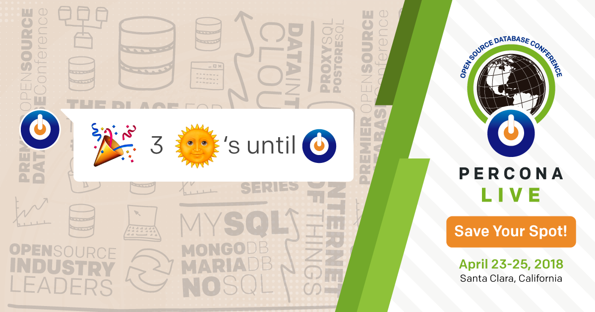 Are you ready for Percona Live 2018It’s hard to believe Percona Live 2018 starts on Monday! We’re looking forward to seeing everyone in Santa Clara next week! Here are some quick highlights to remember: