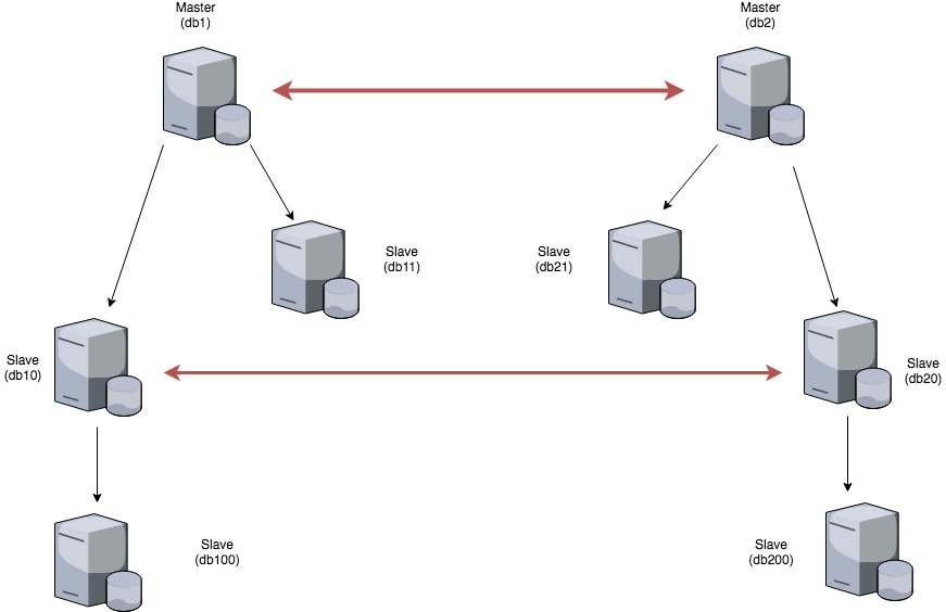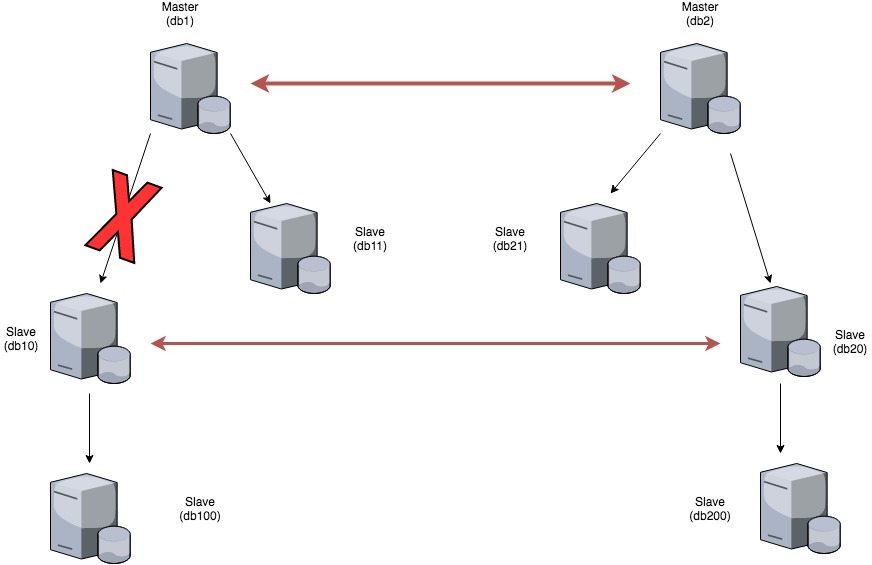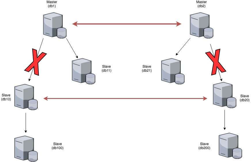I started looking into this setup when a statement broke replication between db1 and db10. Replication broke due to a statement executed on a schema that was not present on db10. This also resulted in changes originating from db1 to not being pushed down to db100 as db10, as we stopped the replication thread (for db1 channel).
