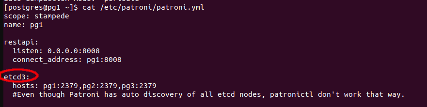 $ cat /etc/etcd/etcd.conf.yaml<br>name: 'pg1'<br>data-dir: /var/lib/etcd<br>initial-advertise-peer-urls: http://10.3.188.140:2380<br>listen-peer-urls: http://10.3.188.140:2380<br>advertise-client-urls: http://10.3.188.140:2379<br>listen-client-urls: http://10.3.188.140:2379,http://localhost:2379<br>initial-cluster: pg1=http://10.3.188.140:2380,pg2=http://10.3.188.138:2380,pg3=http://10.3.188.104:2380<br>initial-cluster-state: new<br>initial-cluster-token: pgcluster |
