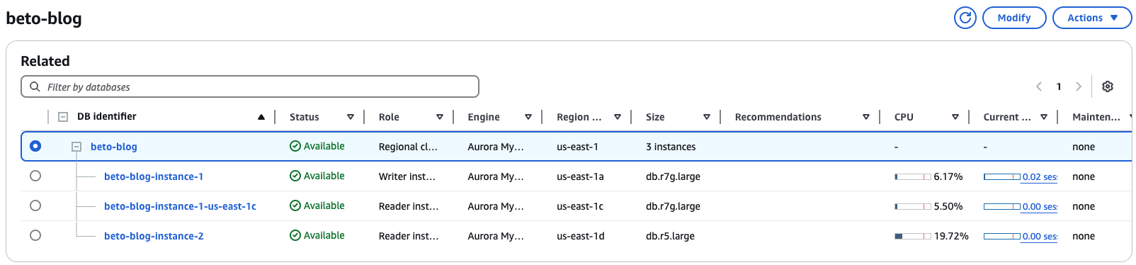 In case of a replica error, the switchover will not happen, and checking on the Log & events tab on the deployment, you’ll be able to see a similar error message: “Switchover from DB cluster beto-blog to beto-blog-green-usht2d was canceled due to replication errors on beto-blog-green-usht2d. Correct the replication errors and then switch over.”