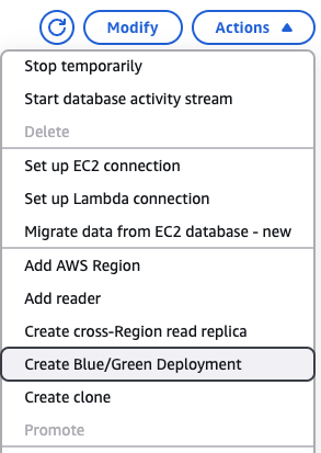 To create the Blue/Green environment, use the dropdown menu for actions and select the “Create Blue/Green Deployment” button.