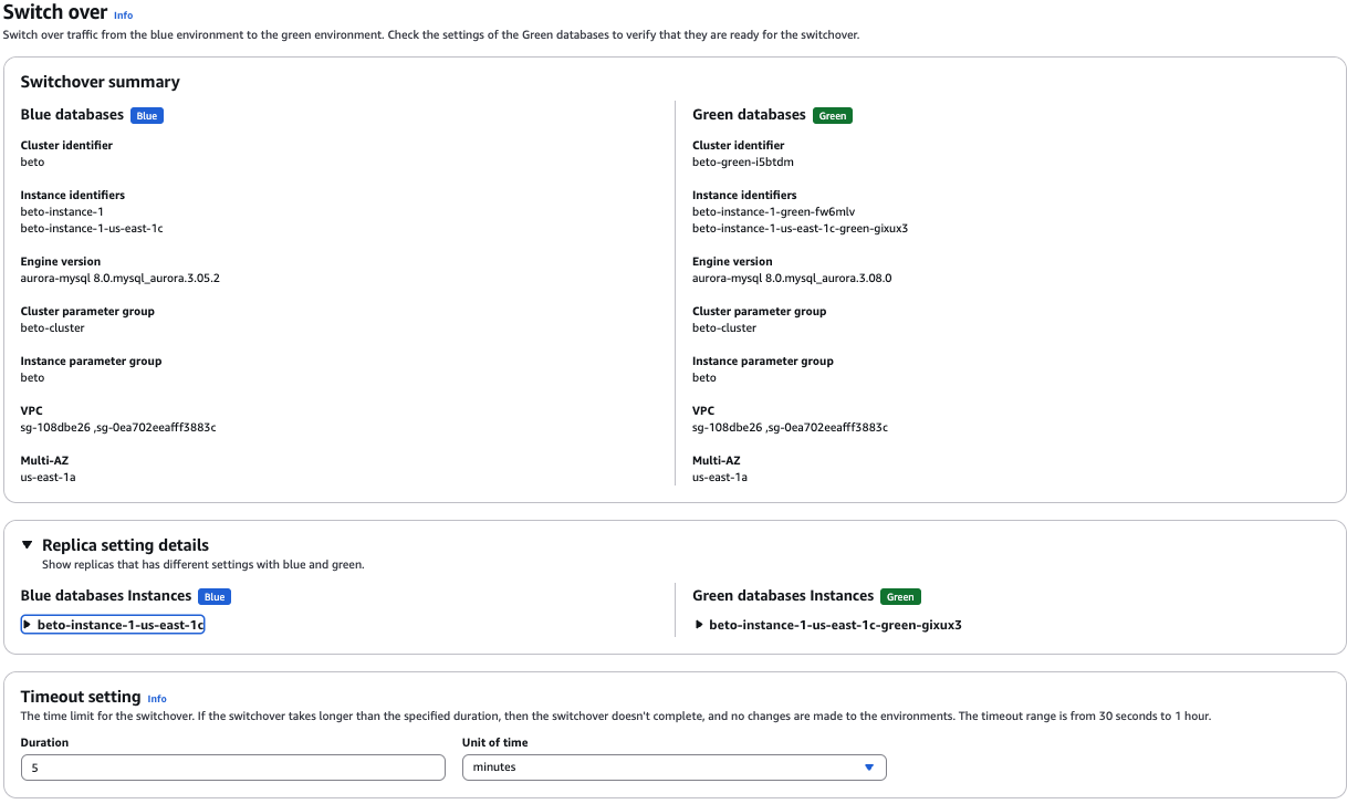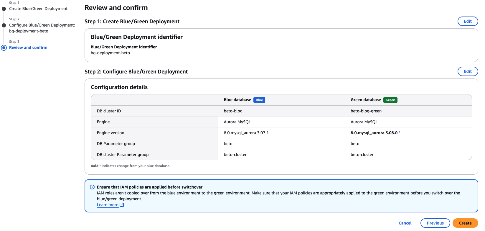 Before creating the Blue/Green environment, please review the configuration carefully. Remember that you can change the Aurora version during the creation process. This option allows for validation checks before the upgrade since all data will be replicated in the green environment.
