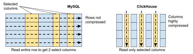 These are strong claims. To understand them it is helpful to look at how ClickHouse differs from MySQL. Here is a diagram that illustrates how each database pulls in data for a query that reads all values of three columns of a table.