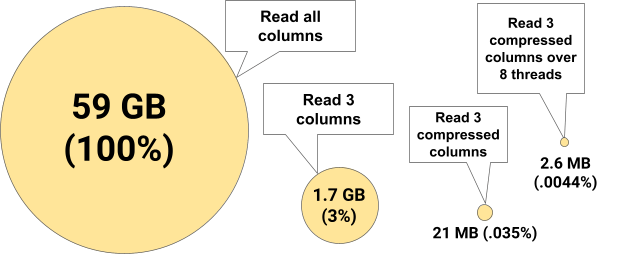 The amount of data you read, how greatly it is compressed, and the ability to parallelize work make an enormous difference. Here’s a picture that illustrates the reduction in I/O for a query reading three columns.